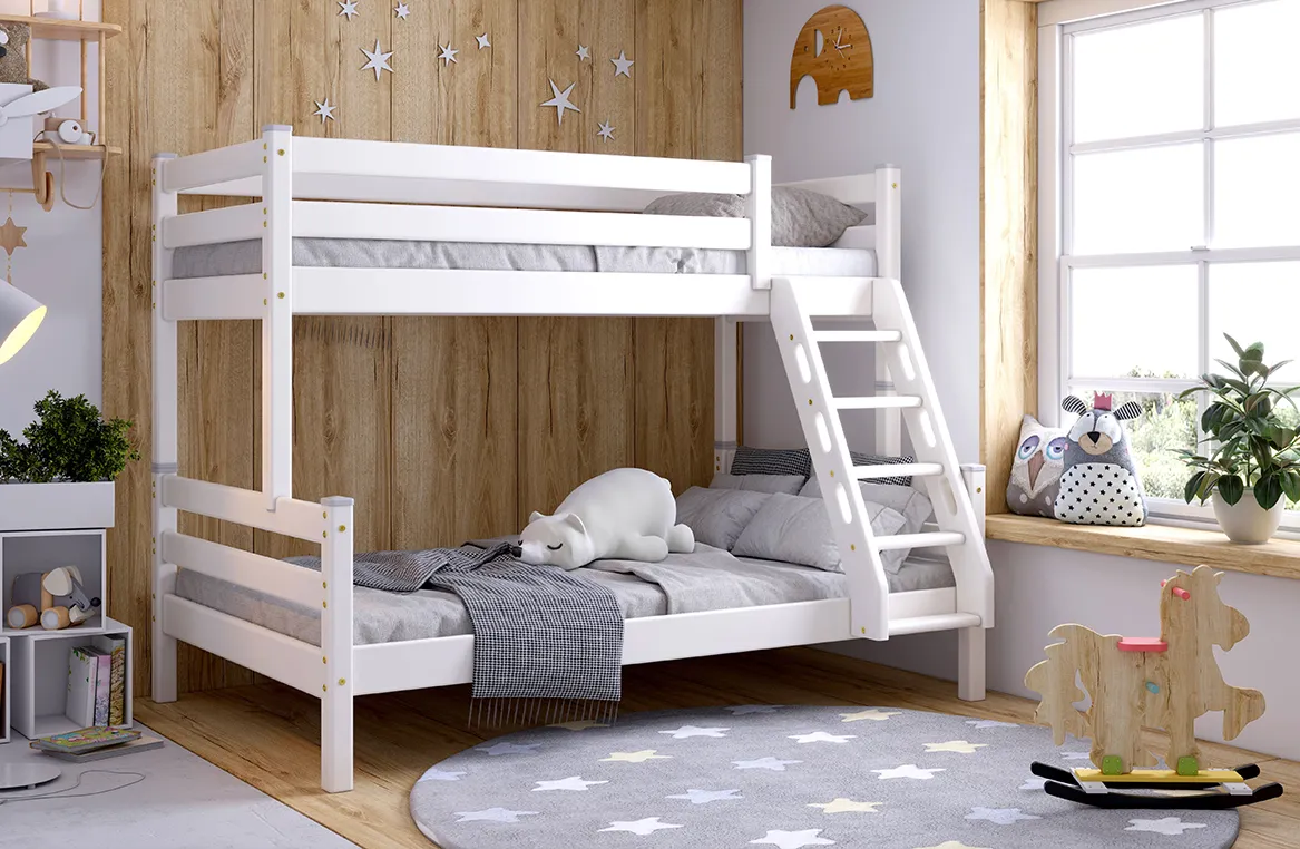 • Экономия пространства: два спальных места занимают место одной кровати, освобождая площадь для игр и учёбы.