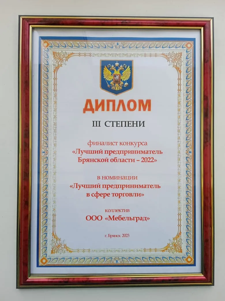 ООО "Мебельград" стала финалистом конкурса "Лучший предприниматель Брянской области – 2022". Сегодня в Хрустальном зале регионального Правительства прошла церемония награждения победителей.