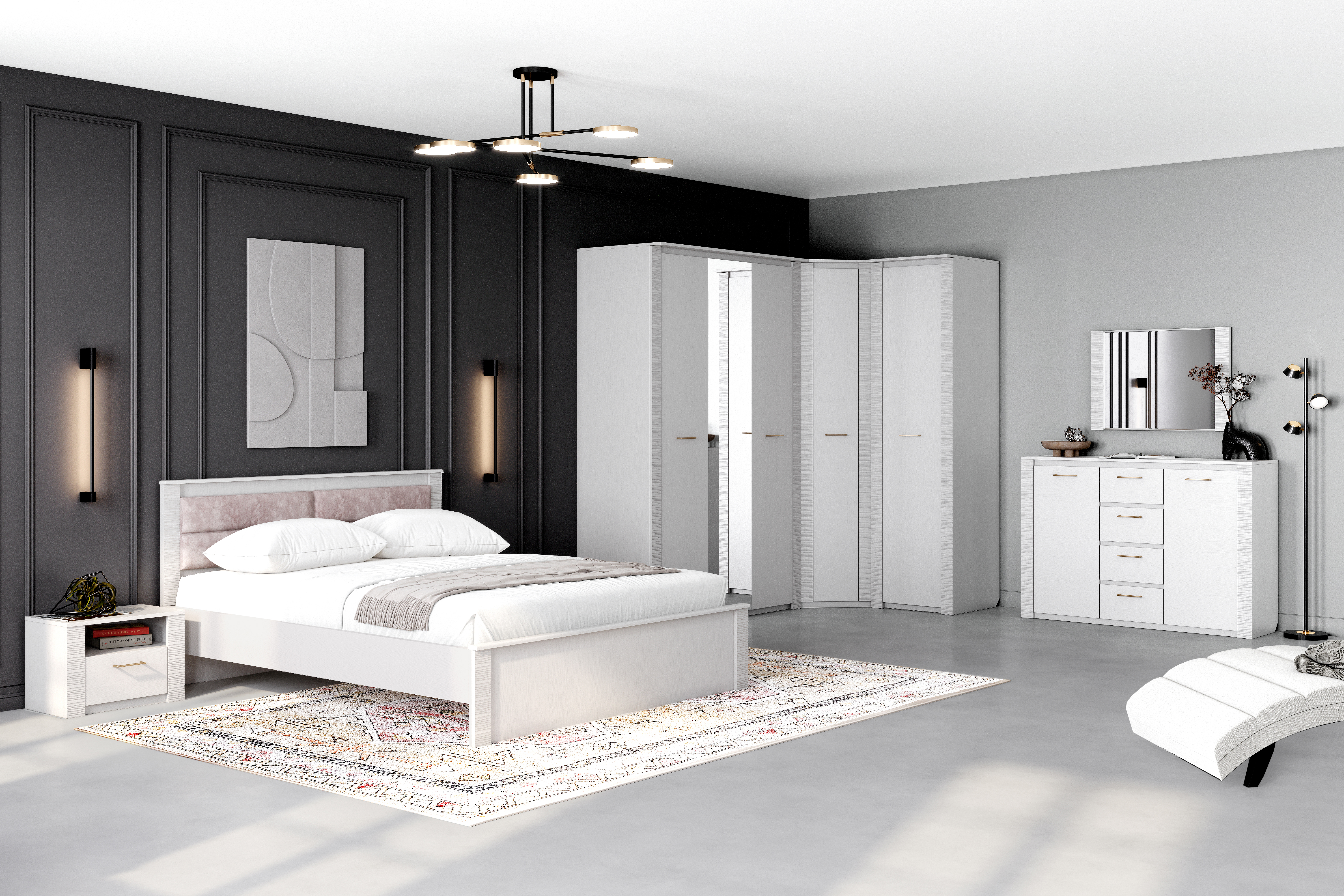 Серия мебели для спальни с нежным названием "Элана" такая же мягкая и романтичная. В ней воплощены самые актуальные тенденции мебельной индустрии, основой которых сегодня является акцент на мягкие, природные, естественные линии. Все это отражается в деталях коллекции: фрезерованные планки, подсветка, мягкие элементы кровати, - делают эту спальню изысканной и необыкновенной.